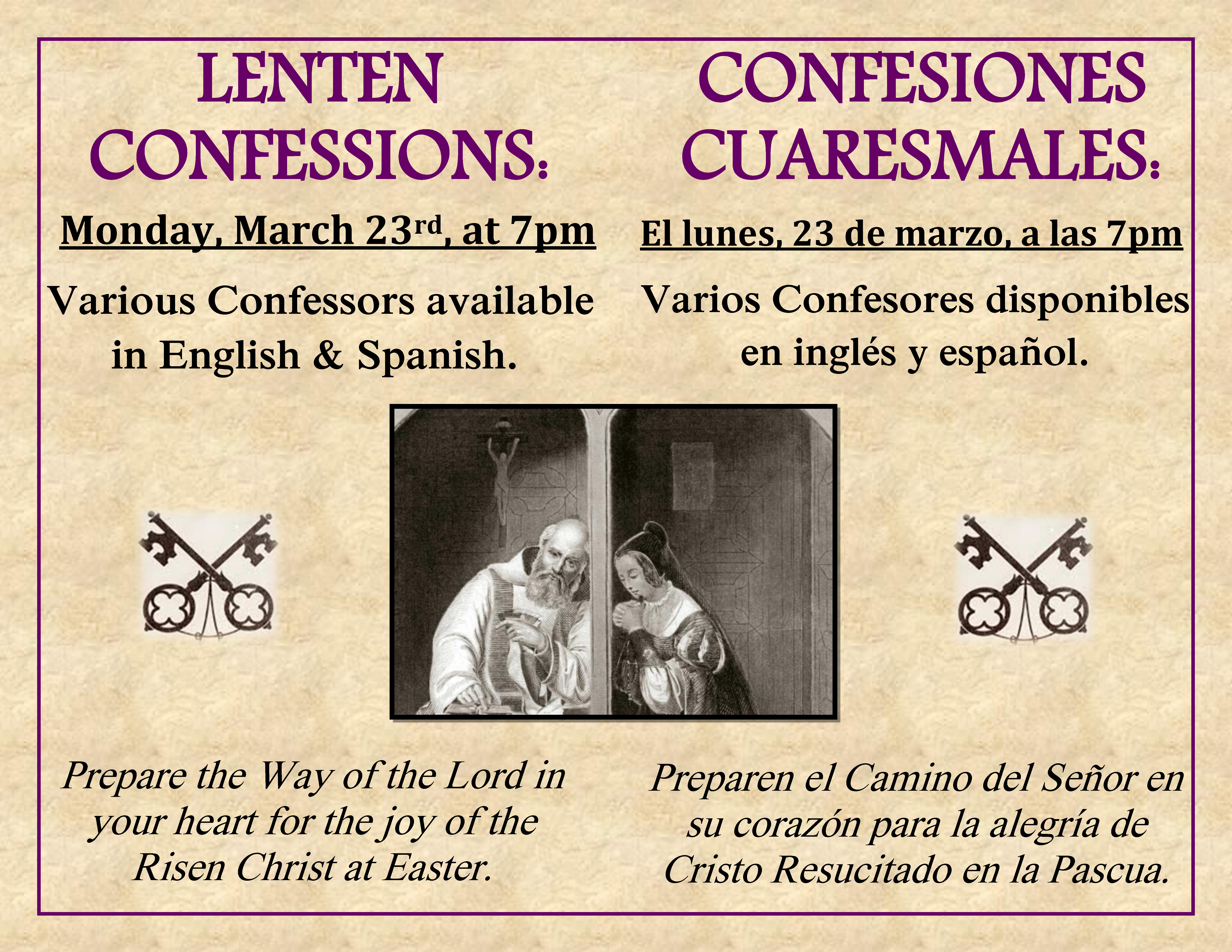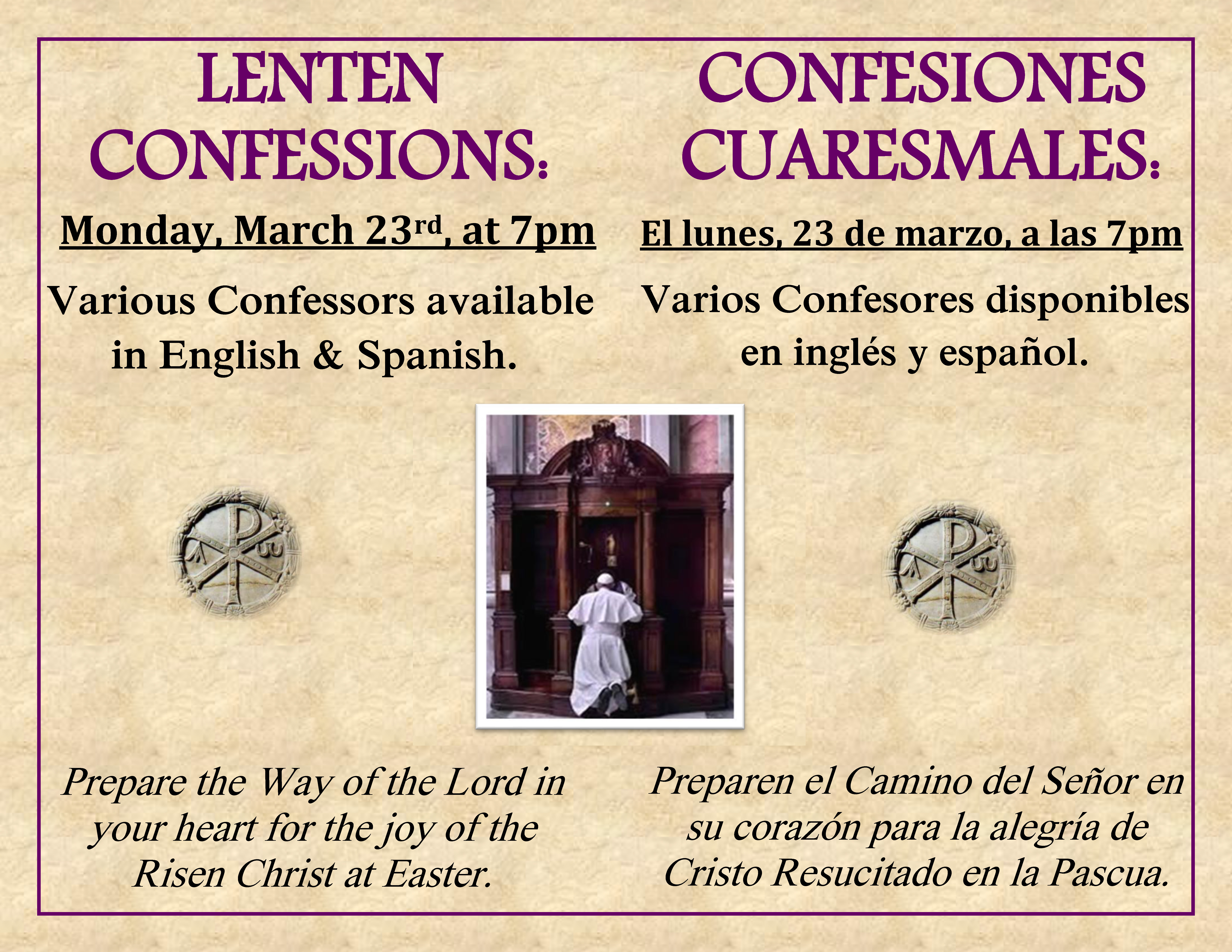 Saturday: 5 pm (English); 7 pm (Spanish)
